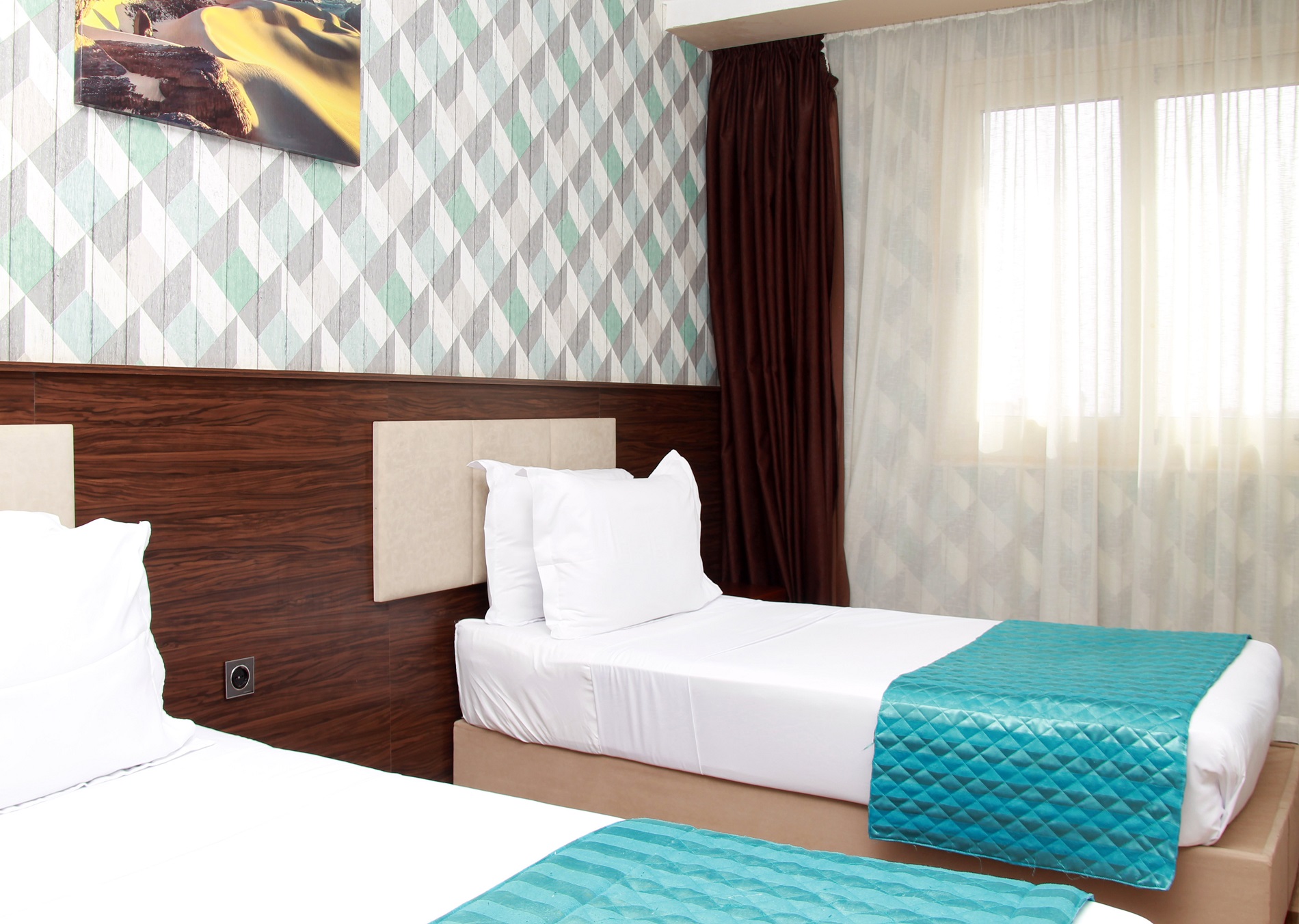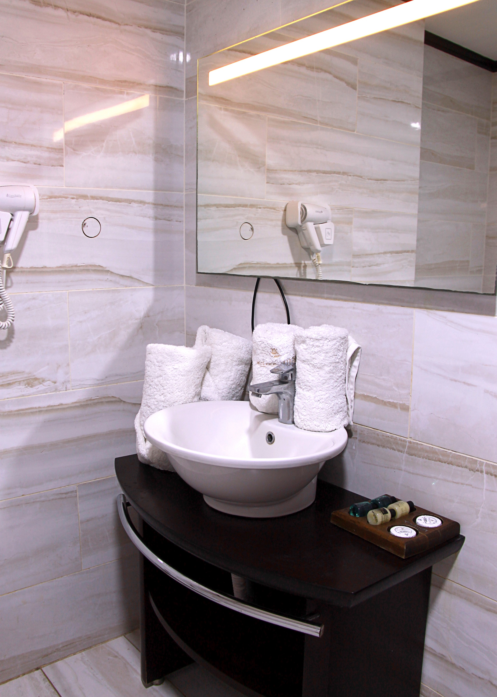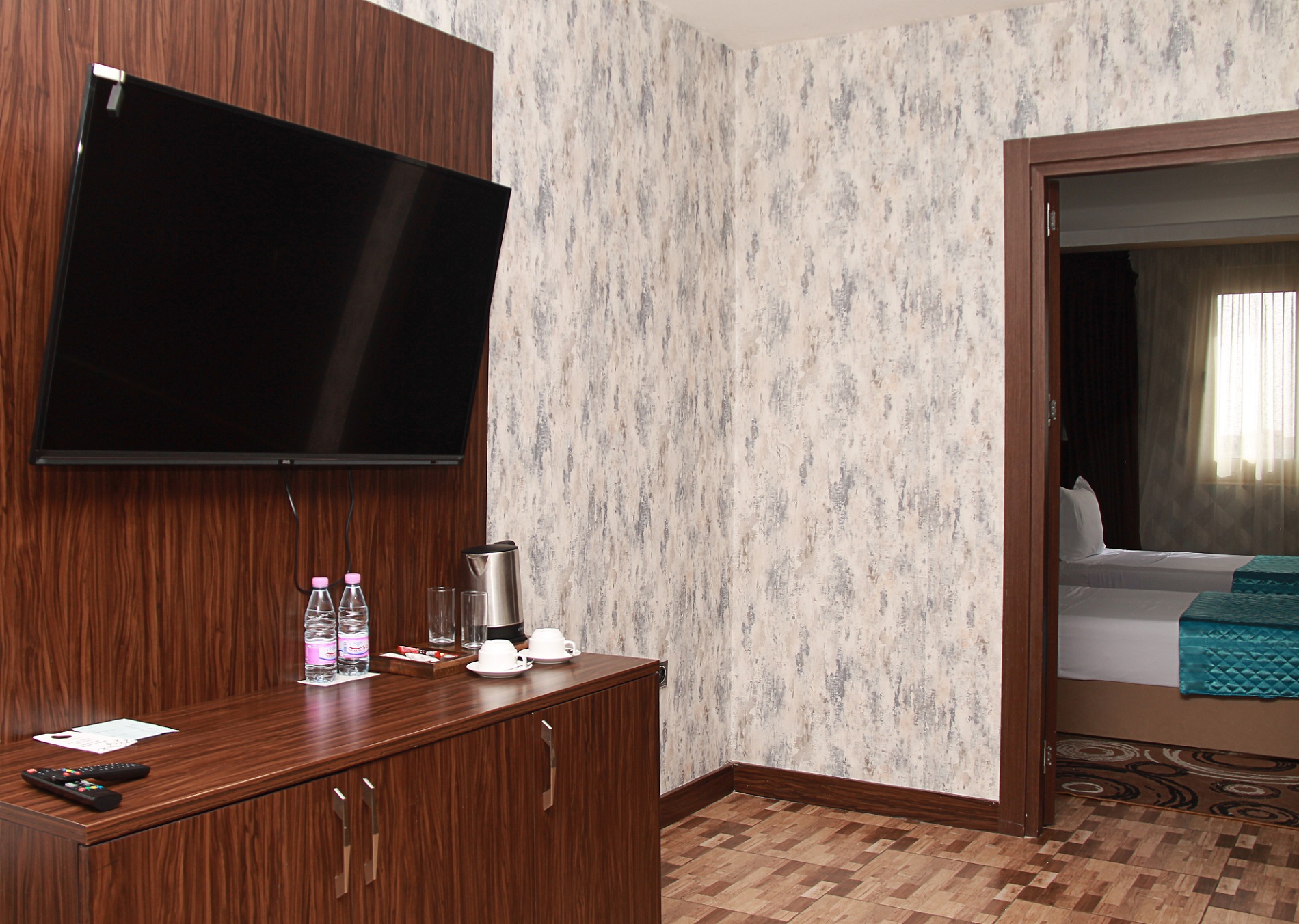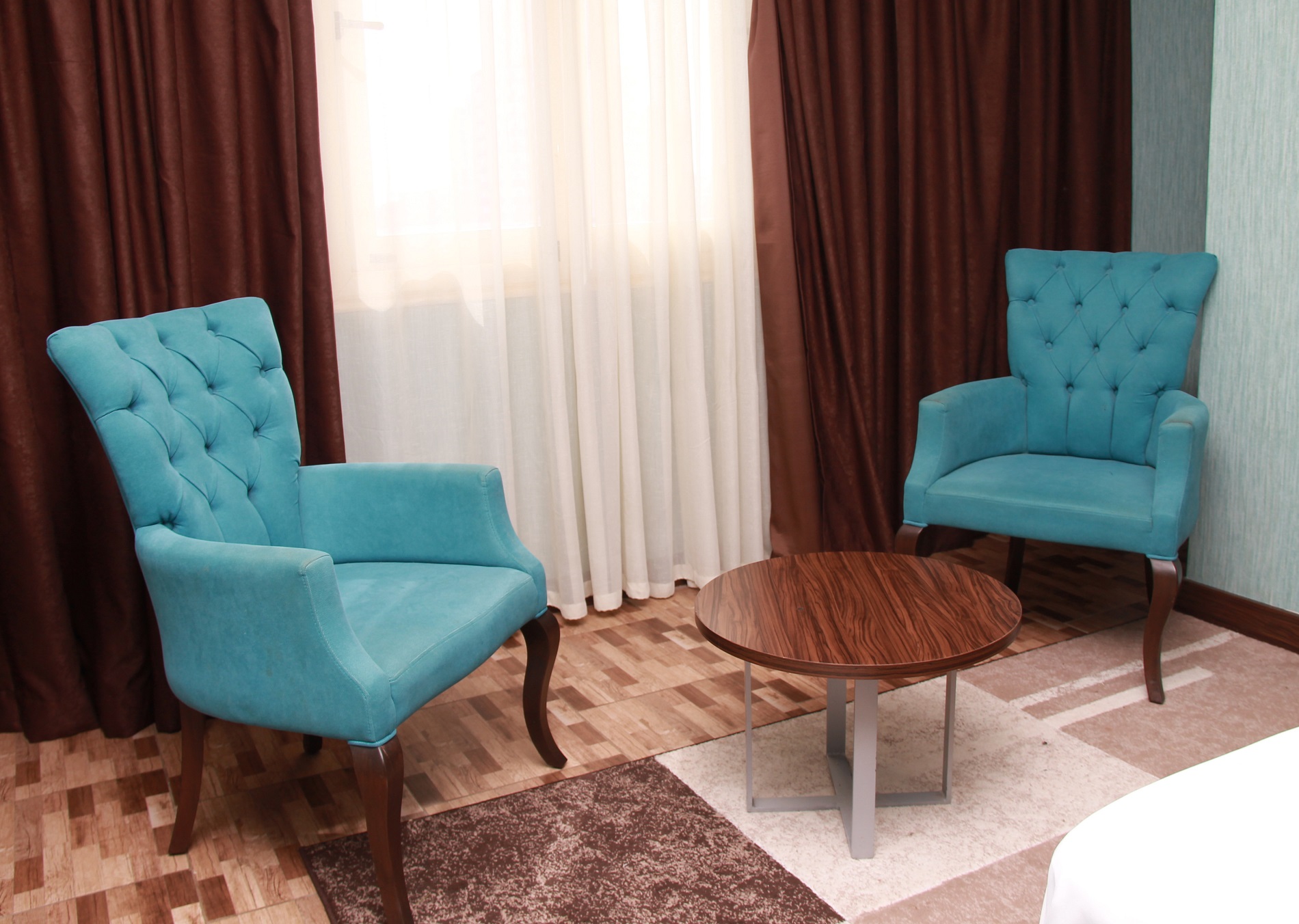 Deux chambres, une chambre Single et une chambre double avec avec King size bed (Lit), 1 living room, armoire/penderie, espace bureau, minibar, plateau de courtoisie, connexion wifi gratuite, téléphone, télévision intégrée HD, chaînes satellite, chauffage, climatisation, deux (02) salles de bains (baignoire) et douche à l’Italienne, sèche-cheveux, produits d’accueil de luxe, navette aéroport.